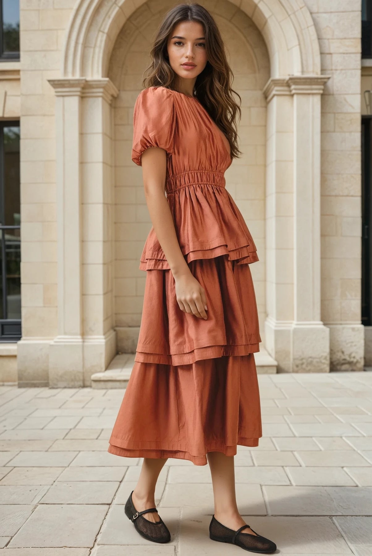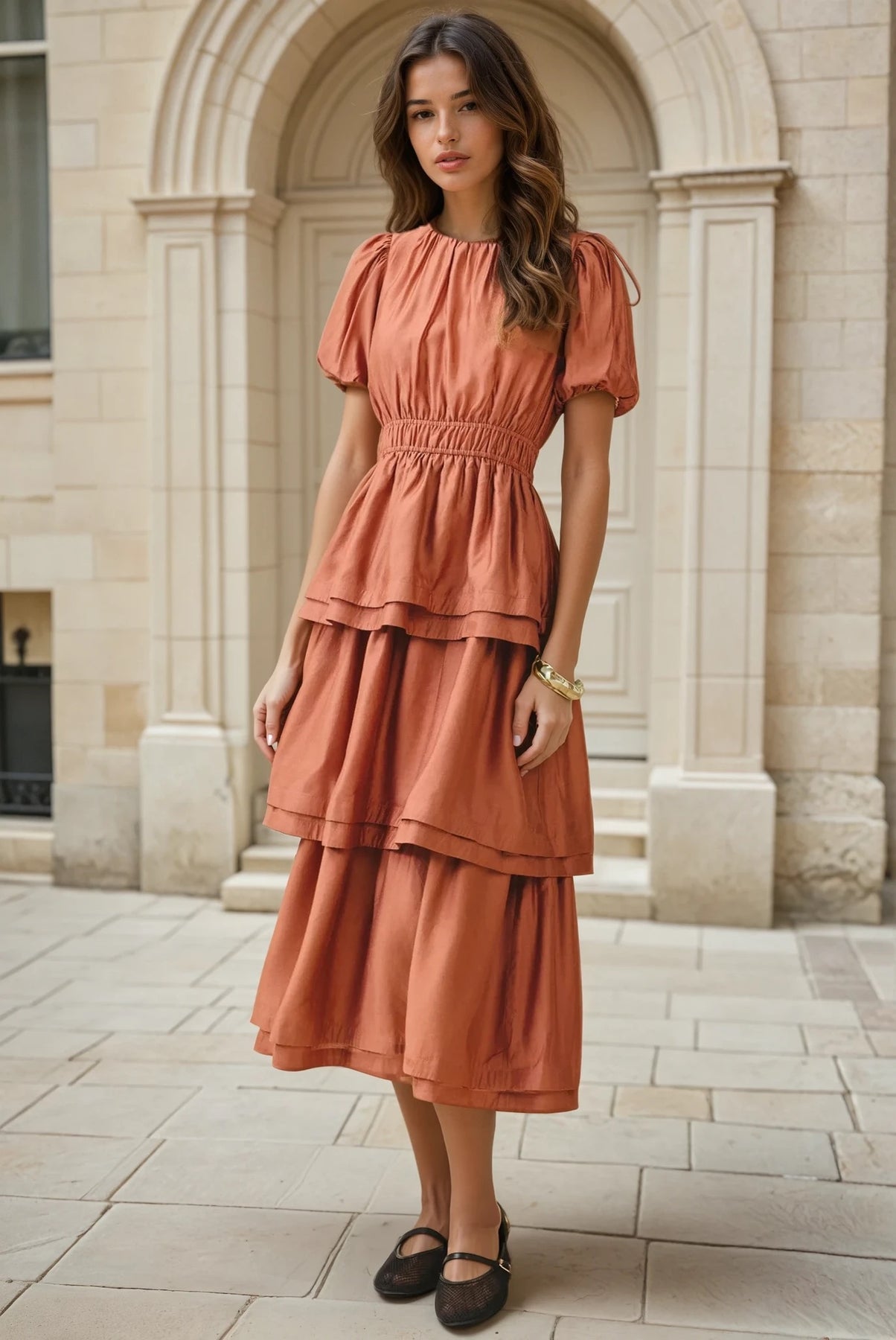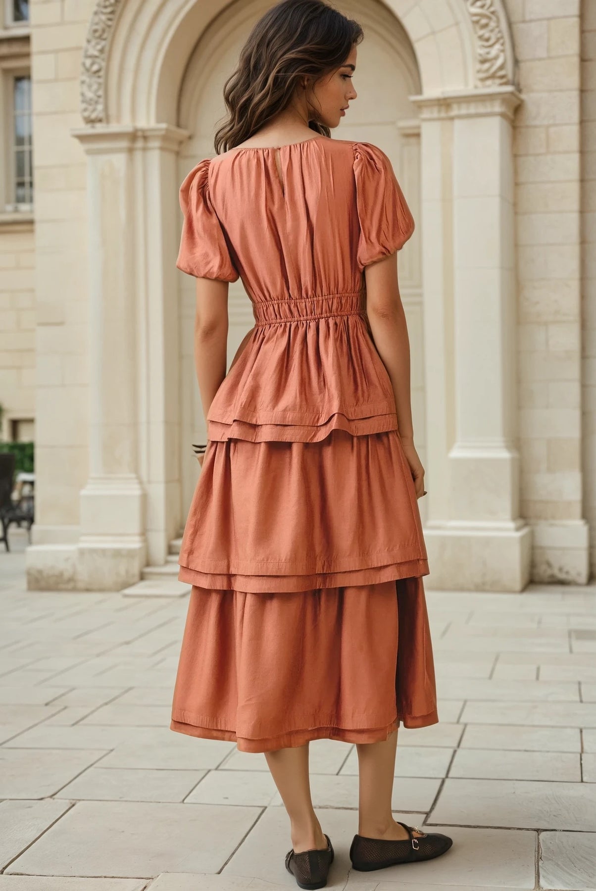 Pleated midi dress in rust